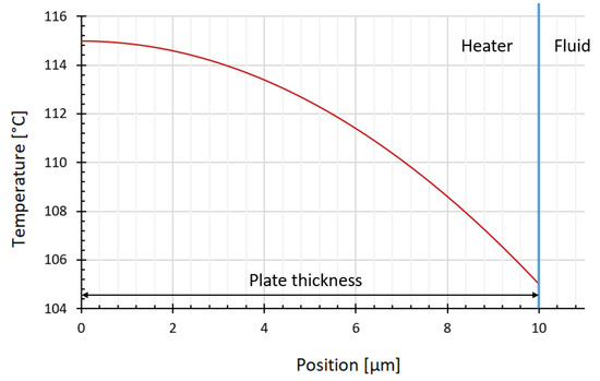 The 1D steady-state problem–solution: the temperature within the plate (thickness 10 µm).