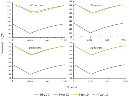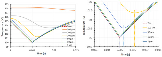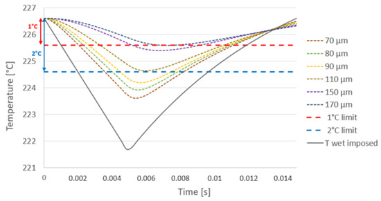 Figure 13 displays the variation in the temperature on the dry side of the plate for the previous time-depending boundary condition (Section 3.2.3) as a function of the plate thickness (ranging from the 1 µm blue curve to the 500 µm orange curve). It appears that for thicknesses higher than the 100 µm yellow curve, the calculated dry temperature strongly differs from the wet temperature.