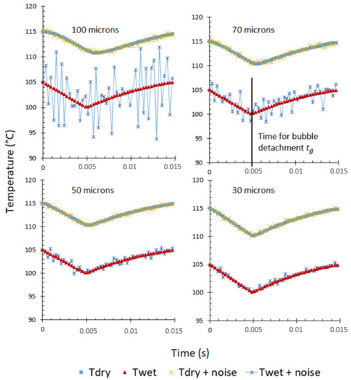 A 70 µm thickness enables detecting the change of slope and, therefore, the time of detachment of the bubble, which makes it possible to measure the frequency of bubble detachment from the wall. However, the apparent noise shows an oscillation of 5 C around the actual temperature value. For the study of boiling that is envisaged on the future device, a more accurate temperature measurement may be of interest. Indeed, the classical wall-superheat models indicate that a few degrees of variation are expected for the given set of conditions, and the noise of the measurements restricted to 1 or 2 C will make it easier to identify the temperature to be compared with the models.