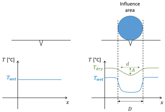 When a bubble grows at a nucleation site, a temperature variation results under the bubble. Figure 19 shows the area of influence of a bubble on the wall temperature. When there is no bubble, the temperature is constant (right side), when a bubble grows on the wall (left side), the temperature variation studied in 1D appears on a zone, defined here as being the bubble diameter. The temperature variation on the dry side then appears to be attenuated in amplitude, and the influence area is expanded because of 2D diffusion effects. It is important to check that this temperature variation is measurable in two steps: (i) check that the amplitude A of this variation is measurable and, therefore, larger than the resolution of the camera (its ability to detect a temperature variation), (ii) check that the size of the spot d is larger than a camera pixel, to be able to detect it.