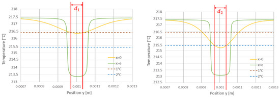 Figure 21. Example of the verification of the zone of influence of the temperature variation according to criteria 1 and 2. Here, for a pressure of 20 bar, for a thickness of 170 µm (left), criterion 1 is respected, the zone of influence is 60 µm; for the second criterion (right), it is necessary to reach 100 µm of thickness to detect the influence area on the dry side. This problem–solution was solved with the following values: , , , s, s, s, , A, T = 5 C, = 502 J/K·kg, = 15 W/m·K, = 7960 kg/m.