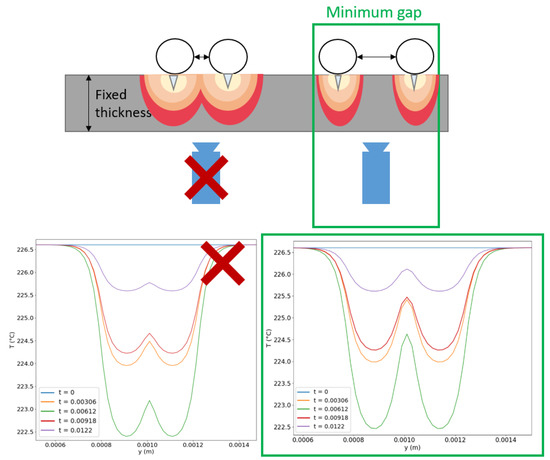 Example of the determination of the minimum gap for two bubbles to be discernible. For the first example (left), the bubbles are too close, and the temperature on the dry side will not allow discretizing two objects except for one big bubble growing on the plate. For the second example (right), after expanding the distance between the bubbles, the temperature field allows detection of two different spots.