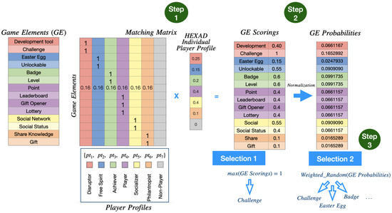 Note that the selection of the top-scored game element slightly constrains the experience of the user, who may end up losing their gamification engagement. In the static adaptive gamification approach, since the Player Profile does not fluctuate during the experience, the top-scored game element will always be the same and the user will therefore only interact with a single game element, even if that game element varies in appearance or reward values. In order to provide more variability in the gamified experience, we selected game elements by considering the scores of the game elements as probabilities. Thus, we used the normalised scores of the GE Scorings vector (Step 2 in Figure 1) as the probability that each game element is shown. We selected a weighted random value of the GE Probabilities vector shown in the Step 3 of Figure 1, instead of selecting the top-scored ones, as Lavoué did.