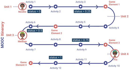 Gamified MOOC itinerary: students’ statuses are depicted from 0 to 1 relying on the Learning Activities (Newbie, Medium, and Pro avatars are shown in different parts of the itinerary). Game Elements (GE) between activities are displayed using small red circles. We developed a new XBlock in the edX platform able to add a Game Element to the MOOC itinerary; see video Adding a Game element Xblock in edX, accessed on 12 January 2023.