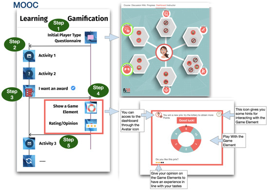 Additionally, we incorporated a dashboard so that the student could be informed at all times of his or her progress in the game (see top right of Figure 3). In this figure, we also show how the gamification is embedded in the learning itinerary. In Step 1, students answer a Player Type Questionnaire to define their Player Profile, which is needed for the both the StaticAG and DynamicAG adaptive strategies. students have the choice of not answering the questionnaire, in which case we consider the player profile to be a non-player. In [17], we proposed the use of the player type questionnaire [32] https://www.gamified.uk/UserTypeTest2016, accessed on 1 December 2022. Users see their initial Player Profiles, i.e., the results of the questionnaire in the Dashboard embedded in the course. The Dashboard highlights the Player Profile, showing the students their player types with the highest scores (see green circles). It also allows students to interact with already obtained game elements and to select their avatar. In Step 2, the course starts with the learning activities of the first formative unit. At the end of some activities, gamification becomes active when students ask for their award, and only when they claim it (Step 3), the gamification algorithm is triggered to suggest the game element to be displayed (Step 4). In this step, as we can see in the bottom right in Figure 3, the student can perform several actions: (i) ask for more information, (ii) check her game status on the dashboard, (iii) play with the game element (for instance, play the lottery), and (iv) rate the current game element with stars. All these interactions are recorded by the gamification system which, in the case of dynamic adaptive gamification, will be used to recompute the Player Profile. Finally, in Step 5, the control passes to the learning system, and the next activity in the formative unit of the course will follow.