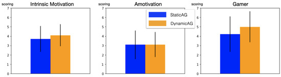 The data gathered with the SIMS questionnaire helped us to test the internal validity of the experiment since significant differences would have an impact on the interpretation of the results of the study. We observed that students started from a very similar state of motivation because no significant differences were found (see Figure 4). Specifically, although the DynamicAG group had a slightly higher intrinsic motivation (IM) than the other group, this difference was not significant (U Mann–Whitney, p-value = 0.9265460; p > 0.05 so we accept the null hypothesis). Amotivation was almost the same in both groups (U Mann–Whitney confirms this fact; p-value = 0.99498195). Similarly, the DynamicAG group started with higher results than the StaticAG group in the G-Gamer measure, but the difference was not significant either (U Mann–Whitney; p-value = 0.37294404). In the two groups, we observed that the “gamer motivation” (G) indicator was the highest, followed by the “intrinsic motivation” (IM) indicator and finally by the “amotivation” (A) indicator. The value of the G indicator reflects the willingness to “play” of both groups, which is desirable for performing our experiment.
