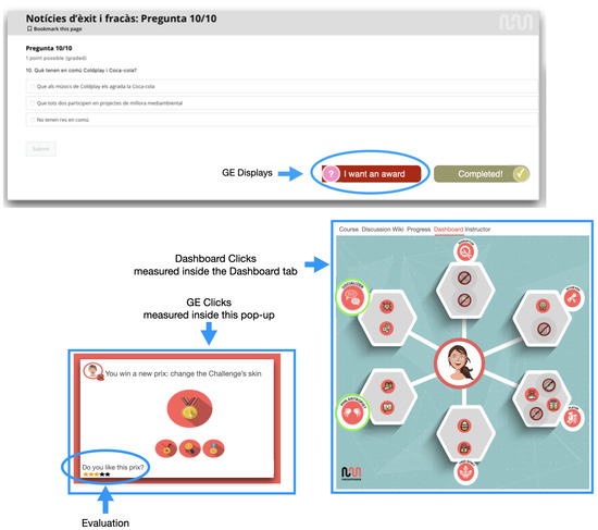 Top: are collected using clicks on the button I want an award. Bottom left: are monitored using clicks on the GE, while refer to the scorings of each displayed game element using stars. Bottom right: refer to those clicks made in the dashboard window.