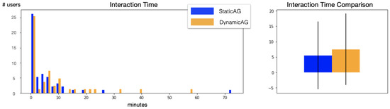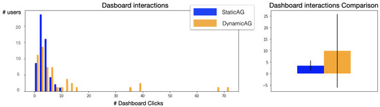 Figure 6 presents a comparison of the values between the StaticAG (blue bars) and DynamicAG (orange bars) groups. On the left, the histogram shows that the majority of the users in the StaticAG group interacted less with the Dashboard (all the values are between 0 and 10 clicks), while users in DynamicAG were more active in using the dashboard. Indeed, the comparison of the means (right side of the figure) confirms that the difference is significant (Brunner–Munzel test, p-value = 0.040 < 0.05; Cohen’s d = 0.5821). In relation to the dispersion in , we analysed the data thoroughly and realised that it corresponded to students who played games regularly, suggesting that this element may have been familiar to them and that they were therefore more inclined to visit the dashboard.
