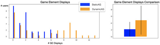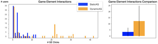 Game elements are not only aesthetically appealing but are also interactive since they allow students to get rewards, e.g., the lottery, the gift, or sending a tip to workmates. Figure 8 presents the average number of users’ interactions with game elements during the whole experience (). The distribution of orange bars along the entire x axis indicates that students in the experimental condition (DynamicAG) interacted more with game elements than those in the control condition (Brunner–Munzel p-value = 0.011 < 0.05; Cohen’s d = 1.0001 large effect size). However, this metric gives low values in both conditions, which can be explained by the discoverability of the designed elements [49]. That is, the students did not notice that some elements were interactive.