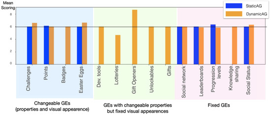 As can be seen in the figure, several game elements have no score in StaticAG (badge, gift, lottery, development tool, knowledge share, lottery, and unlockable). The reason for this is that the fixed game elements corresponding to the initial player profile limited the number of mechanics shown to the students and, as a consequence, they were not able to score them. This was not the case for the DynamicAG group, where all the 14 game elements were shown and scored by participants.