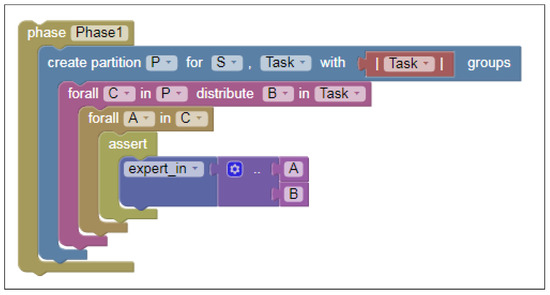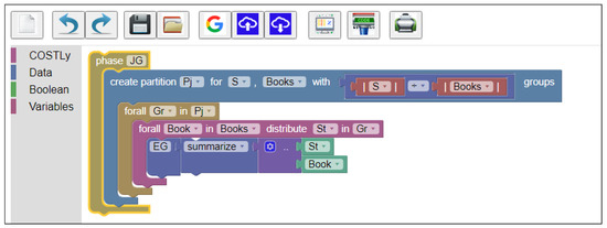 In order to give an intuitive example of the above, let us write the second (JG) phase of the popular Jigsaw script [4]. Let S be the set of all the participant with a cardinality and a set of books named (let denote its cardinality). Our specific Jigsaw example, in its first Expert Group (EG) phase of the script, allocated participants in groups, and each group had to study and summarize a distinct book. The information of which book has been summarized by whom is asserted as new knowledge in COSTLyP during the EG phase and can be accessed during later phases. In the second, Jigsaw Group (JG) phase of the Jigsaw, members of groups should have read different books during the EG phase.