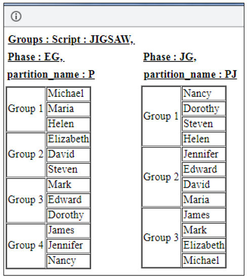After the instantiation of a script, COSTLyP can direct all the given information to its dedicated component (backend) that will try automatically to search for a group formation valid in the terms of the set of rules described by the script and the user-determined instance. The results of this process are presented to the end user of COSTLyP. These results can be used for the enactment phase of the script in the user’s specific setting. For the JigSaw example, results may have the following form (Figure 4):