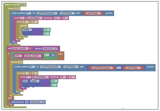 In order to facilitate the learning process of COSTLy language for educational practitioners, we developed an online graphical editor using Google Blockly library [17]. This library enabled us to build an editor such as Scratch [18], transforming the process of writing the textual representation of a script (as in Listing 1) to a puzzle creation in which interconnection of appropriate blocks builds a visual representation of the script, as shown in Figure 2 below.