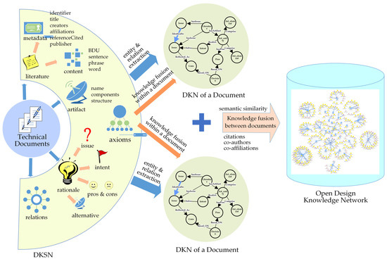 To realize the acquisition, storage, and understanding of the design knowledge contained in technical documents, the concepts of DKN and ODKN are presented. Based on the semantic web, ontology, and knowledge graph, a metamodel of Design Knowledge Semantic Network (DKSN) is proposed to construct the knowledge network. The DKSN covers the ontologies of three dimensions, including the literature ontology, the artifact ontology, and the rationale ontology, and relations that connect the knowledge of the three dimensions to construct an organic knowledge network system. As shown in Figure 1, there are three steps in the construction of a design knowledge network: