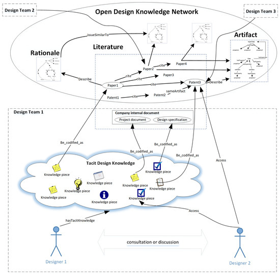 To promote the sharing and reuse of the design knowledge, Jia et al. [20] proposed an approach to capturing tacit design knowledge using knowledge graphs. On this basis, we propose the concept of ODKN, which is a knowledge network composed of knowledge from various documents, which integrates the knowledge of various design teams. As shown in Figure 2, most of the design knowledge is tacit knowledge, especially DR, which usually resides in the designer’s mind. Due to the nature of tacit knowledge, it is hard to codify, and only a small number of knowledge pieces are explicitly recorded in patents, design specifications, journal articles, and others. This has also led to the fragmentation of DR. Only by integrating fragmented DR and by building a knowledge network can designers quickly query and discover, and directly understand, to achieve the purpose of design knowledge reuse.