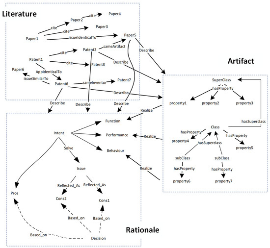 The DKSN covers three dimensions of knowledge, including literature knowledge (metadata, such as author, affiliations, keywords, title, citations, and contents), artifact knowledge (the inheritance and composition relationship of design objects), rationale knowledge (issues, intents, pros/cons, and alternatives), and the relationships between them. Artifact is about design object knowledge, and rationale is about design process knowledge. Both are described in the literature in a specific writing style, as shown in Figure 3.