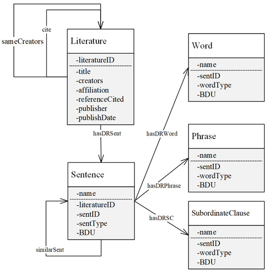 Literature Class. The literature refers specifically to technical documentation in the field of engineering design. Literature has the dual characteristics of linguistics and informatics. From a linguistic viewpoint, literature (including documents, paragraphs, sentences, clauses, and phrases) could be characterized as syntactics, semantics, and pragmatics. Syntactics are usually identified via form, order, format, and structure. Semantics represent the meaning or a relationship of the real world, expressed using phrases or symbols. Pragmatics is about context. The metadata information is the property of the literature, such as the title, creators, affiliations, references cited, publisher, publishing date, and others, as shown in Figure 4.