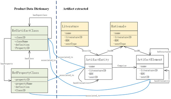 Reference artifact class. To form a knowledge network of artifacts, a reference product data dictionary is introduced. As shown in Figure 5, the reference product data dictionary can be constructed using the ontology modeling approach, including the reference artifact class and the reference property class. These product ontologies consist of hierarchies of characterization classes of products built according to a common methodology that is intended to enable multi-user consistency. The extracted artifacts from documents can be associated with the appropriate reference class or property of the artifacts. Hence, the extracted artifacts can be connected to the knowledge network.