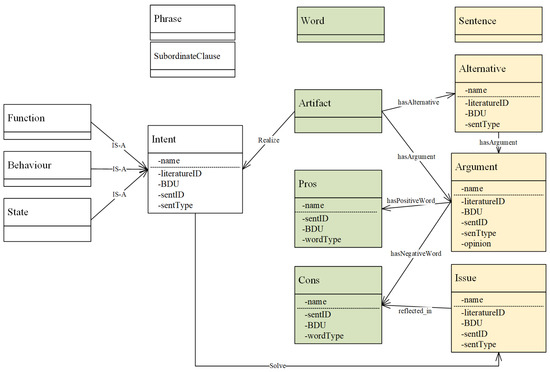 Word, phrase or subordinate clause. Words, phrases, and subordinate clauses form sentences that can express some basic meaning; they are shorter and more intuitive than sentences, and they are easy for designers to understand. Feature words in the technical literature can be divided into the following: stop words, predefined artifact words, literature words, positive or pro words, negative or con words, issue words, alternative words, Describe relation words, Realize relation words, THERE_BE relation words, and structural relation words, corresponding to the “wordType” attribute in Figure 4.