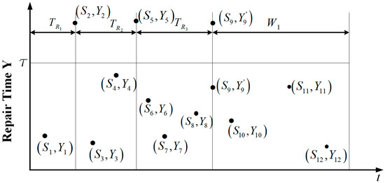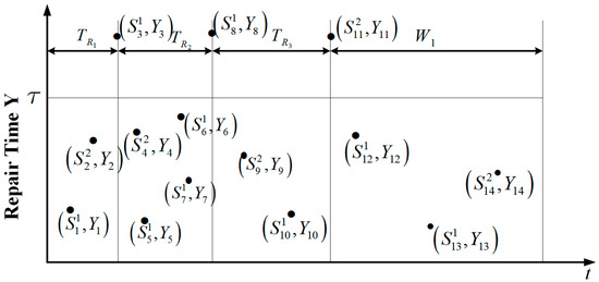 In Figure 1, the repair time for the first failure does not exceed the threshold , while the second one exceeds the threshold. Furthermore, the total time that the product goes through two failures does not exceed the warranty period , so the product is replaced at time and the time for the first renewal of the warranty terms is . Similarly, the product is replaced at the fifth failure and the duration between the first and second renewals is . The repair times for the sixth failure, the seventh failure, and the eighth failure do not exceed the threshold , but the number of failures exceeds the threshold 3; therefore, the warranty terms are renewed. During the following warranty period, the product goes through four failures and their repair times do not exceed the threshold, so the warranty terms are not renewed and the warranty service ends. The length of the whole warranty period is and 12 repairs are performed.