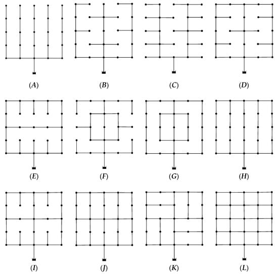 Geometric structures of the model grid network (A–L). Total pipe lengths (m): (A): 2400; (B): 2400; (C): 2400; (D): 2600; (E): 2600; (F): 2600; (G): 2700; (H): 2800; (I): 2900; (J): 3200; (K): 3200; and (L): 4000 m.