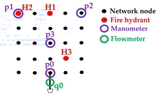 In the second phase of the research, the problem of the uncertainty of pressure sensor indications was omitted. In the simulation studies, a network monitoring system was used, including the measurement of the pressure in four, identical in all variants, water demand nodes (p0, p1, p2, and p3), and the flow rate of water supplying the first node (q0). The location of the measurement points is shown in Figure 2. Simulation studies of the effectiveness of leak detection by the system of sensors designed in this way were carried out in three phases. In the first phase, during the simulation tests, each of the selected hydrants was assumed to open again and an attempt was made to find its location using the p0 and q0 sensors. Then, the monitoring system was gradually expanded to include the p1 sensor, then the p2 and p3. In total, 144 simulations were carried out at this stage. In order to locate the leakage, the Darwin Calibrator module of the Bentley WaterGEMS software was used. The Darwin Calibrator uses a genetic algorithm (GA). The general idea of the Darwin Calibrator is to compare the measured and calculated values of the same parameter and search for the most appropriate solution based on the principles of natural evolution and genetic reproduction [38]. The leakage is figuratively presented as an emitter coefficient, which is most often used for fire flows in hydrants [39]. The emitter flow varies as a function of the pressure available at the associated node, in accordance with the formula (Equation (2)) [40,41].