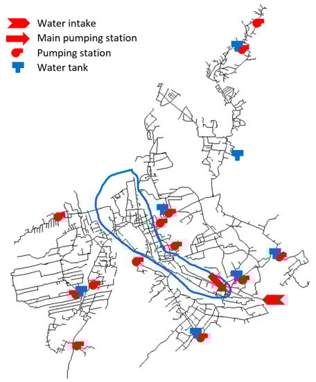 Geometric structure of the water supply network along with the location of the water intake, pumping station, and water tanks. The blue line designates the analysed zone.