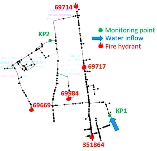 The DMA 02 zone, which covers approx. 6500 m of water pipes and 443 junctions, was selected for experimental research. There are two monitoring points in this zone: KP1 (flow rate and pressure measurement) and KP2 (pressure measurement). The location of the measurement points is shown in Figure 5. The considered zone is characterised by a significant capacity reserve, resulting in a stable spatial distribution of the pressure head. The difference between its minimum and maximum values during normal operation ranges from 7.49 to 7.87 m H2O.