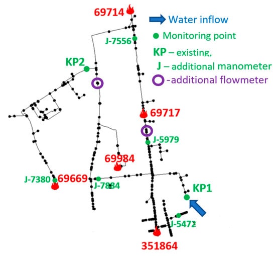 The further phase of the experiment was carried out in a manner analogous to the first one, but after installing additional five portable hydrant manometers in the analysed DMA zone. In the third stage, the measuring system was equipped with two portable flowmeters. The location of additional pressure gauges and flow meters is shown in Figure 6.