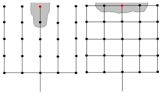 Figure 7 shows an exemplary contour plot of networks with the smallest (A) and the highest (L) degree of complexity and the size of the pressure head changes caused by the opening of the hydrant. The range of correct pressure readings by the installed manometers was assumed as 0.8 m H2O. The open hydrant was marked by a red dot in Figure 7. In the case of the A network, the assumed range of reduced pressure covers two nodes, and in the case of the L network, three nodes.
