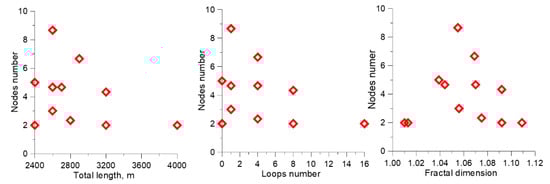 Table 1 summarises the number of nodes located in the area of the pressure head lowered by at least 0.8 m H2O after opening the H1, H2, and H3 hydrants. Figure 8 presents graphs showing the average number of these nodes depending on the total length of the pipes, the number of loops, and the fractal dimension of the analysed network.