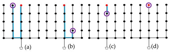 In the second stage, it was assumed that there were no measurement uncertainties in the sensors used. The simulation tests carried out showed that in each case the tested monitoring system detected a leak. However, it did not always correctly indicate the leak location. Only in 70 out of 144 cases did the location of the leak coincide with the location of the open hydrant. In other cases, the so-called length of the error (the distance between the indication of the leakage location and the open hydrant, calculated along the network pipelines) ranged from 100 to 1100 m. Figure 9 shows the exemplary results of indicating the leakage location represented by opening the H1 hydrant in network A, in the case of using only the sensors: (a) p0 and q0; (b) p0, p1, and q0; (c) p0, p1, p2, and q0; and (d) p0, p1, p2, p3, and q0. The location of the open hydrant is marked with a red dot in Figure 9. The estimation of the leak location is marked with a purple circle. The so-called length of the error is marked with a blue line. In the case of (d), the location of the leak coincided with the location of the open hydrant. Table 2 lists all the error lengths calculated during the simulations in networks A–L.