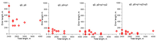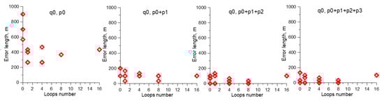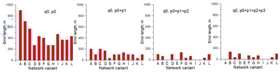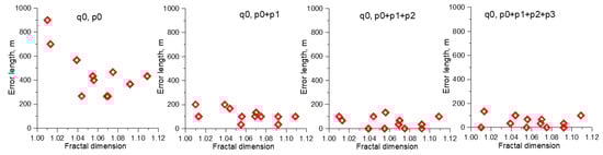 Figure 10 shows the average error length for each of the analysed network variants, depending on the number of monitoring sensors used. There is a clear tendency to decrease the average error length with the increase in the number of network sensors used. Interestingly, adding the p3 sensor to the system consisting of q0, p0, p1, and p2 sensors did not cause a significant change in the calculated average error length. The calculated average error length was compared with the total length of the pipes (Figure 11), the number of loops (Figure 12), and the fractal dimension (Figure 13) of the analysed networks. In all cases presented in Figure 11, Figure 12 and Figure 13, there seems to be no clear relationship between the calculated average error length and the total length of the pipes, the number of loops, or the fractal dimension, which may suggest the lack of such relationships. However, it is worth noticing that there is a significant reduction in the average error length after adding the p1 sensor to the analysed networks, supplementing the measurement of the network entrance. Adding more pressure sensors did not cause significant changes in the size of this error, regardless of the complexity of the network.