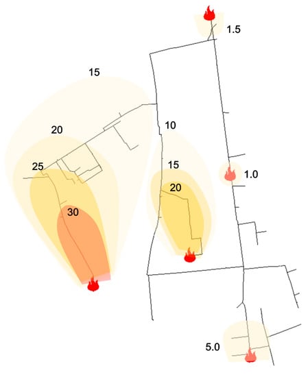 In the first phase of the case study, the size of the pressure head drop in the network, caused by the successive opening of the five fire hydrants indicated in Figure 5, was checked using a calibrated numerical model, analogically to Section 2.1. The hydrants were opened at the hour of maximum water demand in the analysed DMA 02 zone. The abnormal situation alarm threshold was assumed to be a pressure drop of 5.0 m H2O. This value resulted from both the measurement uncertainty of the installed manometers (±2.0%) and the existence of continuous, up to 4 m H2O, pressure fluctuations in the analysed zone. The observed amount of pressure head drop due to the opening of the hydrant is presented in the form of a contour plot graph.