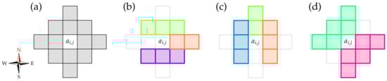 - The SST in the northwestern neighbourhood (see Figure 5d) of decreases before the one in , and the SST in the southeastern neighbourhood of either decreases after the one in or increases (this condition is tested for all the relevant squares in the neighbourhoods separately);