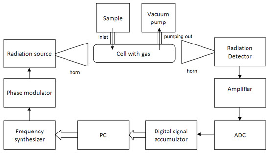 The spectrometer with phase switching of radiation influencing gas [6] (the scheme is presented in Figure 1) has the radiation source generating the frequency of the signal for probing, a phase modulator modulating the frequency of the radiation source, a frequency synthesizer setting this frequency, and a personal computer (PC) controlling the frequency synthesizer. The detector receives the signal after transferring through the gas cell with the sample of gas under study and after interacting with the gas molecules. This signal is recorded and then sent to the amplifier. After amplifying, it is digitized by an analogue-to-digital converter (ADC), and after that, the digital signal passes to the accumulator and is then recorded and processed in the PC. The information about the rotational absorption line is in the signal that arrived at the detector and will not be lost at the next manipulation.