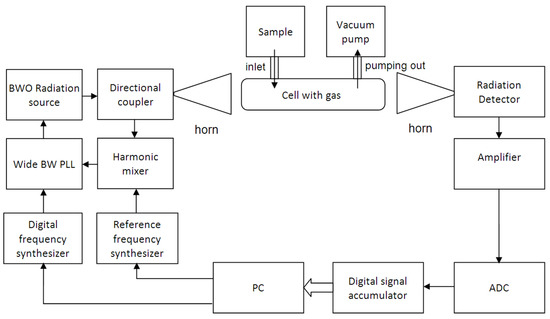 The approach based on a fast frequency sweep through the absorption line was used in the spectrometer with a radiation source on a backward wave oscillator operating in the range from 118 to 178 GHz [14]. Fast sweeping allows for the recording of all the absorption lines throughout the spectrometer’s frequency range and detecting several substances simultaneously. The scheme of the fast frequency sweep spectrometer is shown in Figure 2.