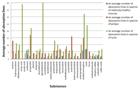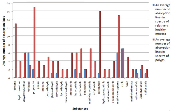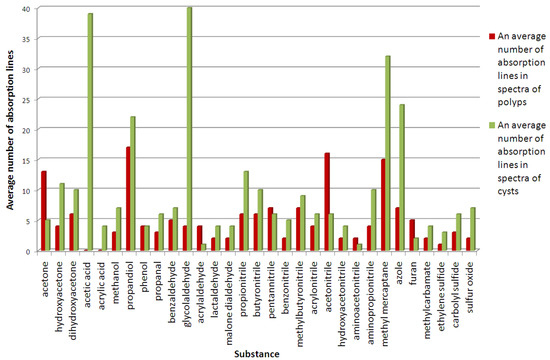 First of all, it should be noted that the absorption lines of acetaldehyde, methyl mercaptan, propanediol, azole, benzonitrile, ethylene sulfide, sulfur oxide, and carbon sulfide are identified both in the spectra of samples of relatively healthy mucosa and in the spectra of polyp and cyst tissues. This allows us to conclude that these substances can be considered markers compiling the metabolic profile of healthy tissue. The analyses of the absorption spectra of polyp and cyst samples demonstrated that the concentration of these substances increases many times when compared to healthy tissue. In addition, during the thermal decomposition of pathological tissue samples, there appear substances such as acetone, hydroxyacetone, dihydroxyacetone, acetonitrile, aminopropionitrile, acrylonitrile, methylbutyronitrile, pentannitrile, and propionitrile, including those with isotopologues, acetic and acrylic acids, glycolaldehyde, and benzaldehyde, which can be regarded as potential markers of pathological tissue.