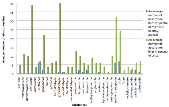 The chemical composition of the products of the thermal decomposition of cysts (green) and relatively healthy mucosa (blue) samples.