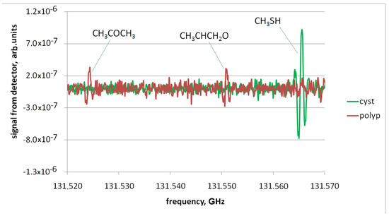 Examples of records of the spectrum section containing lines of individual substances present in the decomposition products of polyp and cyst samples obtained using a phase switching spectrometer and a fast frequency sweep spectrometer are presented in Figure 6 and Figure 7.