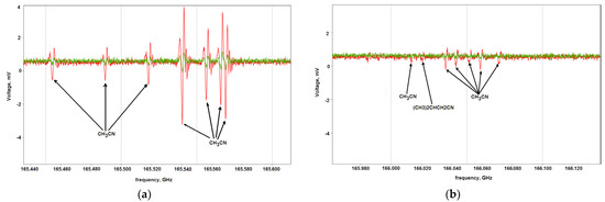 Examples of recording spectrum sections containing acetonitrile (CH3CN) lines for cyst samples (green curve) and for polyp samples (red curve) with different concentrations of acetonitrile in thermal decomposition products. The spectrum of polyp sample contains the methylbutyronitrile ((CH3)2CHCH2CN) absorption line. (a) Acetonitrile lines with frequencies f1exp = 165.4544 GHz, f1cat = 165.4543696 GHz; f2exp = 165.4893 GHz, f2cat = 165.4893907 GHz; f3exp = 165.5182 GHz, f3cat = 165.5180638 GHz; f4exp = 165.5405 GHz, f4cat = 165.5403772 GHz; f5exp = 165.5563 GHz, f5cat = 165.5563219 GHz; f6exp = 165.5659 GHz, f6cat = 165.5658913 GHz; and f7exp = 165.5692 GHz, f7cat = 165.5690816 GHz. (b) Acetonitrile lines with frequencies f1exp = 166.0136 GHz, f1cat = 166.0134004 GHz; f2exp = 166.0361 GHz, f2cat = 166.0358883 GHz; f3exp = 166.0429 GHz, f3cat = 166.0428265 GHz; f4exp = 166.0516 GHz, f4cat = 166.0515011 GHz; f5_1exp = 166.0590 GHz, f5_1cat = 166.0588124 GHz and f5_2cat = 166.0592874 GHz; f6exp = 166.0713 GHz, f6cat = 166.0712258 GHz; and methylbutyronitrile line with frequencies f1exp = 166.0208 GHz, f1cat = 166.0206676 GHz, where fiexp are experimentally measured central frequencies and ficat are frequencies from spectroscopy databases [11,12].