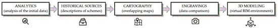 During this study, methods of observation, analysis, and comparison and a reproduction of the research object in a 3D built environment using appropriate software were applied. The corresponding design scheme for implementing the research methodology is shown in Figure 1.