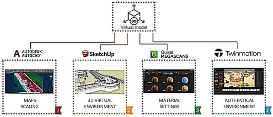 As a result, a virtual model of the historical heritage was created by processing the initial data, scaling the graphic objects, processing texture, and performing a final rendering. The main design stages included map scaling by Autodesk, building a 3D virtual environment using SketchUp, material selection using Quixel Megascans, and creating the final authentical environment using Twinmotion software.