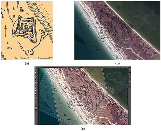 After the analysis of archival, librarian, and cartographic sources, identification of the researched object location was carried out. In this case, the image processing stages were as follows. Firstly, the studied maps were loaded into the program environment to overlay them further. Next, the necessary transparency of the images was adjusted. After applying the free transformation tools, the scheme of the studied object was superimposed on the actual terrain, considering the remains of fortifications and defensive lines. In the presence of a dimensional ruler, there was an additional opportunity to adjust the scaling accuracy. The subsequent stage concerned cleaning up the object plan layer using the tool for removing the white background.
