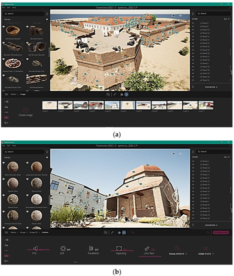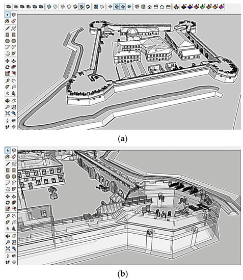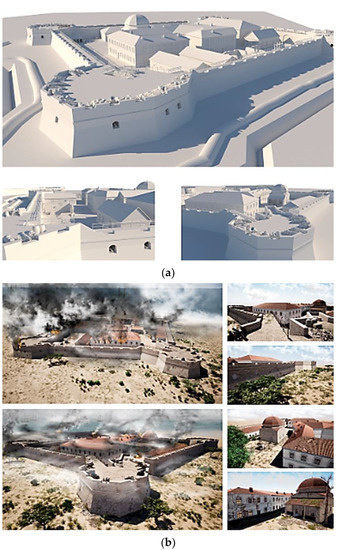 Overall, the applied approach can be used as an algorithm to solve the topical issue of preserving architectural buildings [15,41] and reconstructing historical heritage objects [2]. It also allows for the use of the model in information sources, textbooks, historical overviews, and visualizing the researched built environment with further implementation into VR. Additionally, using the current programs and methods, it is possible to design a virtual model for further reconstruction and develop technical solutions proven for centuries in these buildings and implement them for a new experience.