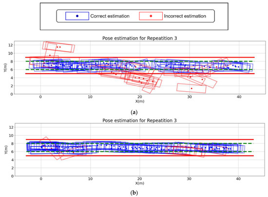 Since ViPER+ solved the problem of incomplete inputs in ViPER, we observed that this method provided the highest update ratio and lowest error ratio, and average error compared to previous methods. In some cases, such as repetition #3 in the LOS scenario, ViPER+ had an equal or higher error ratio compared to the baseline. Figure 10 depicts the output for repetition #3 of the LOS scenario using all the pose estimation methods. We marked the incorrect estimates with a different color to distinguish them from the correct estimates.