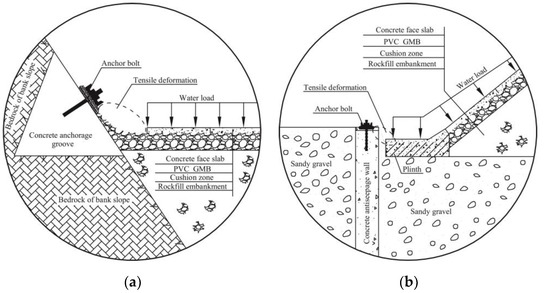 At the peripheral joints of the MFRD, the GMB is placed with one end on the dam surface, relying on the interface friction to maintain stability when subjected to water load [8,9,10], and the other end anchored on the plinth of the dam abutment or the top of the concrete antiseepage wall (See Figure 1). Generally, the GMB on the dam surface can accommodate the local small deformation at the bottom of the gravel cushion, while that at the peripheral joints is subjected to large tensile deformation due to differential displacement between the dam body and abutment. The tensile deformation mainly in the initial impoundment of the reservoir and operation results in decreasing stress, and then the anti-seepage structure is susceptible to failure.