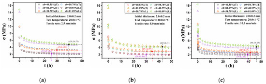 Stress-relaxation rate at different tensile rates: (a) v = 2.5 mm/min; (b) v = 5.0 mm/min; (c) v = 10.0 mm/min.