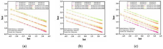 Fitting results of the curves: (a) v = 2.5 mm/min; (b) v = 5.0 mm/min; (c) v = 10.0 mm/min.