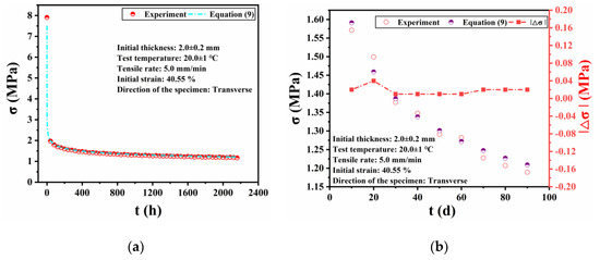 Comparison between the experimental data for 90 d and the calculated results by Equation (9): (a) overall trend; (b) difference in relaxation stress at specified time.